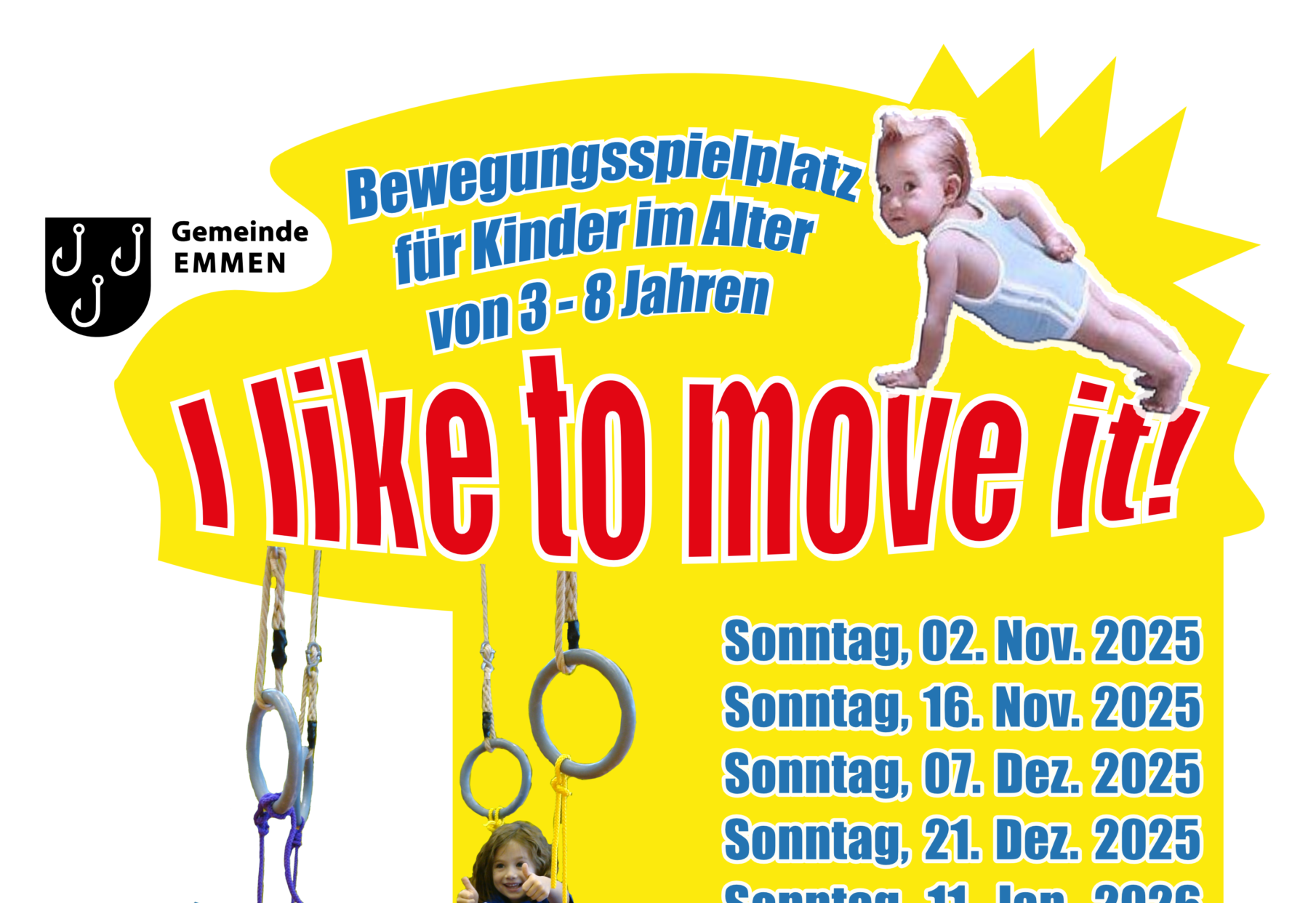 An diesem Sonntagmorgen verwandeln wir zusammen mit der Gemeinde Emmen die Gersaghalle von 10 bis 12 Uhr in einen einmaligen Bewegungsspielplatz. Alle Kinder zwischen 3 und 8 Jahren sind mit ihren Eltern, Grosseltern, Freunden herzlich eingeladen.